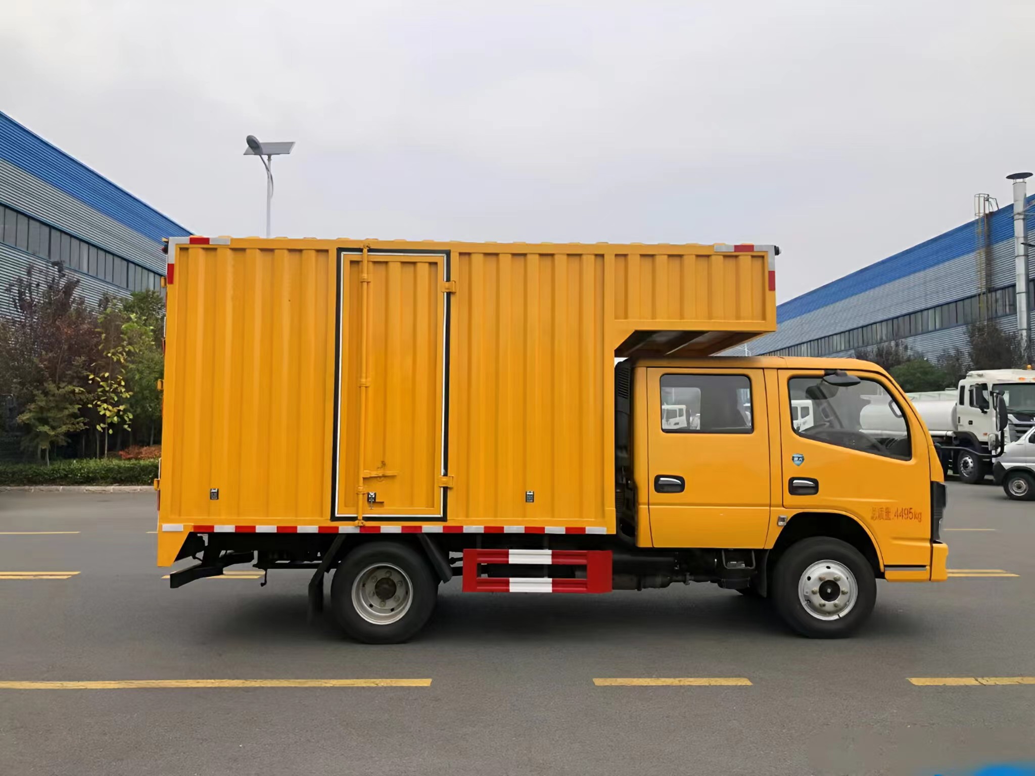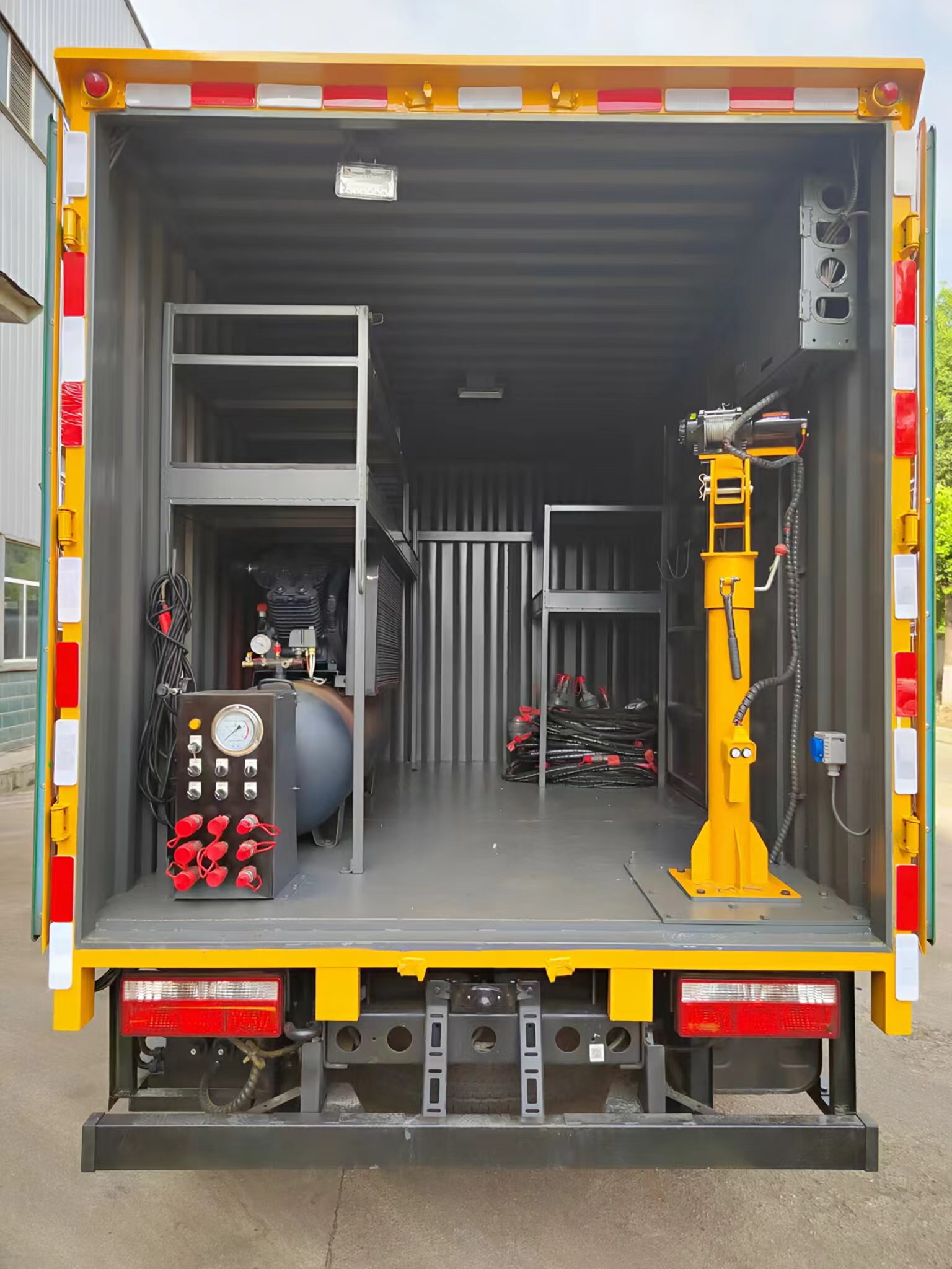 | 上裝配置 | 箱體采用瓦楞箱體,側(cè)面和后面各一個雙開門,箱內(nèi)設(shè)計兩個貨架,箱內(nèi)設(shè)計照明燈,安裝液壓動力系統(tǒng),三套液壓動力取力快速接口,帶控制面板兩臺4寸的渣漿泵,帶水帶和液壓管(帶快接)裝一個液壓驅(qū)動空壓機(jī),一個800公斤12V電控小吊機(jī)安裝3500W逆變器,帶電控箱,其他程力專用車廠家標(biāo)配… | ||