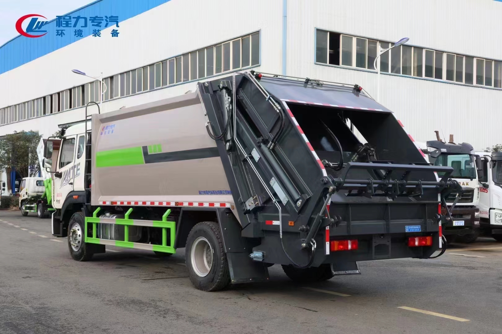 | 上裝配置 | 整車上裝箱體采用高強度鋼制作,容積約16/18立方,新式可破碎刮板,后置污水箱,雙向蠕動壓縮,國內(nèi)知名品牌液壓系統(tǒng),恒力油缸,中梅多路閥,嘉善取力器,合資品牌睿辰鐵殼齒輪泵,駕駛室內(nèi)及車身外集中CAN電控系統(tǒng),尾部可選裝掛桶翻轉(zhuǎn)機構(gòu),帶氣動后蓋,可實現(xiàn)垃圾桶的翻轉(zhuǎn)傾倒上料,亦可選裝擺臂裝置、三角斗裝置、大落地全密封斗裝置等進料裝置。壓縮比高,液壓系統(tǒng)穩(wěn)定可靠,高品質(zhì)、高性價比! | ||