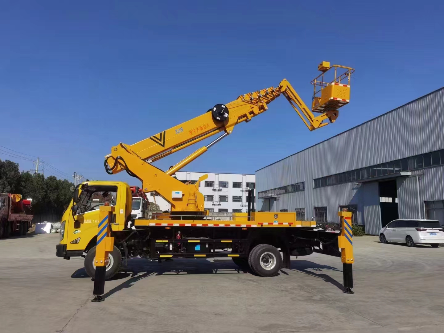 上裝配置 作業(yè)高度32米,帶小飛臂,六節(jié)六邊形同步伸縮工作臂,360度連續(xù)回轉(zhuǎn),配上下車自動互鎖裝置,水平檢測功能,支腿檢測功能,裝有應(yīng)急電動泵,電液比例控制系統(tǒng),實(shí)現(xiàn)無極調(diào)速,液壓自動調(diào)平。